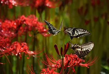 ラスト・チャンス ナミアゲハ♂にとって♀を見つけて求婚する機会としては、メスが彼岸花にやって来るこの時期が1年の最後となると思います。必死に求婚するオスの姿、美しい彼岸花で待っている様な姿がとても美しい光景です。