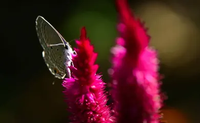 千日紅に可愛らしいシジミチョウをナイスショットです。この蝶さん、クロマダラソテツシジミですね。南方に生息するチョウで日本では南西諸島に居たチョウですが、温暖化のために生息域が北上している様です。可愛らしく愛好家も多いのですが、ソテツを食草としていてソテツを枯らすほどの被害が出る事もあり、害虫扱いされ