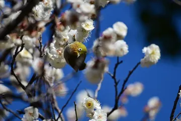 梅をついばむメジロにカメラ目線貰いました。笑連写したものの普段あまり撮らない被写体。ちょこまか動くメジロに悪戦苦闘…と言う事でかなりピン甘です_(^^;)ゞ
