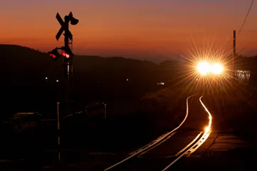 線路へのヘッドライトの反射がいいですね。添えられた信号の灯火がいい仕事をしています。