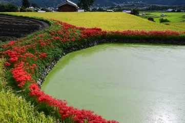 池の周り 間もなく稲も刈り取りを迎えますが、貯水池の周りの彼岸花も満開です。