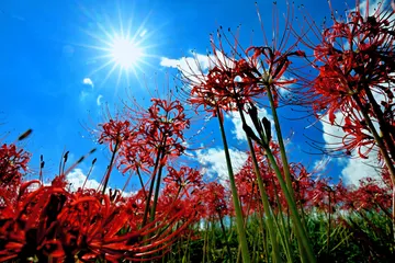 秋の晴日に NikonZ9 Nikkor24-120mm f/4S1/200 f/16 ISO125太陽と彼岸花を組み合わせて撮影しました。