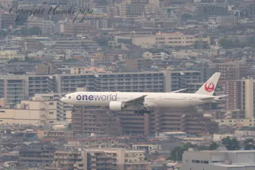 伊丹空港逆風運用、最終アプローチ。JAL B777 「oneworld」 JAL B777 「oneworld」の着陸に向けた最終アプローチ。伊丹空港の逆風運用時にのみ見る事ができるシーン