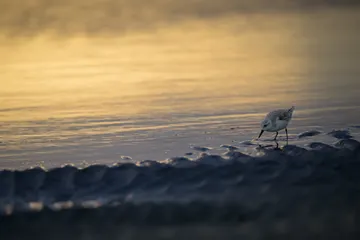 霞の中のミユビシギ この日の干潟は、一瞬、うっすらと霞がかかった。ミユビシギに出演いただき、刹那の光景を写しとめた。