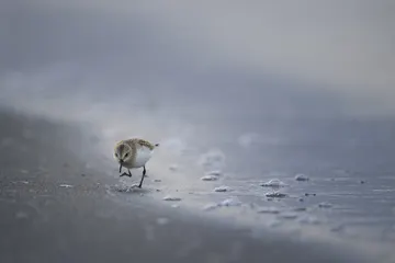 波打ち際のトウネン この日の干潟はほぼ満潮。シギ・チドリの姿はほとんど見られない。そんな中、トウネンが一羽、私の相手をしてくれた。