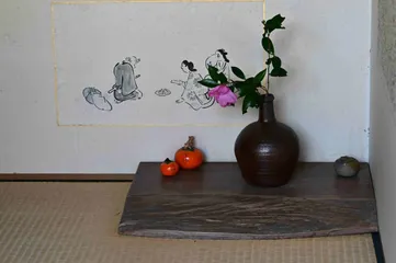 京都落柿舎の小さな床の間です。さりげなく花を一輪。そばに柿の実。実にシンプルな床ですが、味がありますね。