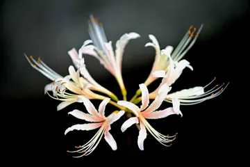 白い曼殊沙華 彼岸花も変種があり、定番の赤い花の他、黄色や白があります。この花を撮影していると近所のおじさんが、どうもお世話をされているようで「綺麗に撮ってや」「その方向は悪い」と沢山の注文を頂きました。結果を見せると「あんた上手いな」と一言頂きました。