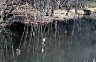 すっかり葉も落ちた林の中の池で、鷺が一匹。