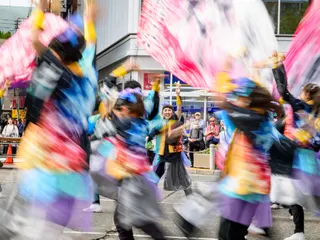 色の乱舞 東京よさこい巣鴨駅前会場です。沢山のチームの踊りが公開される中、写真作品にするには工夫が必要と考え、スローシャッターでトライしてみました。SSをいくつにするか、止まっている被写体があると良いなど、なかなか難しいです。