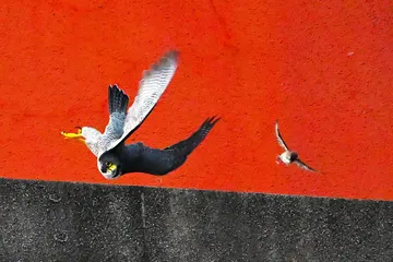 ハヤブサの狩 ハヤブサが小鳥を追って捕獲した。