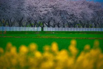 ピンクな桜、新緑のむぎ、黄色の菜の花の三重奏🍡。けっこうな雨が降ってたので暗い🙁2026年4月4日撮影機材:Zf+TAMRON150-500mm