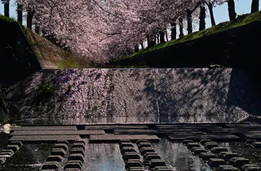 花の井関 川に設けられた井関も桜にまみれて、どことなく嬉しそうですね。