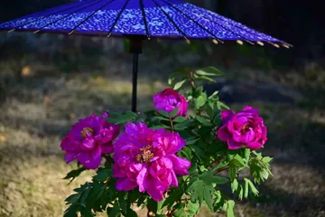 日傘に守られて、咲く牡丹の花。日本の景色でございます。