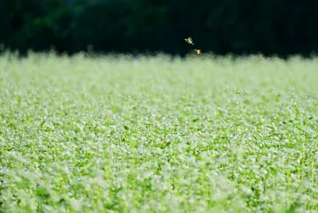 一面に咲く花に舞う番いのアゲハ一組、花咲くそば畑の寸景です。