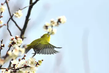 飛び立ち 梅の花の蜜を追ってメジロが飛び立ちました。動きが早いので中々上手く行きませんでした。夢中になっていると興奮した雄鹿が突進してきたため、撮影と同時に避難。