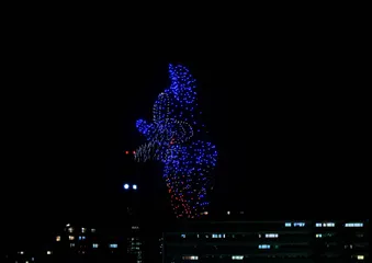 わが町に巨大ミッキー現る (ドローン凄い!) 地元の花火大会に『ドローンショー!』ディズニーキャラクター勢ぞろい巨大ミッキー現る ドローン凄いぞ!! 近所の公園からたったので横姿で来年は、有料席で観よう