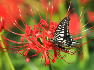 彼岸花と蝶 長い夏が過ぎやっと彼岸花が咲いていた。