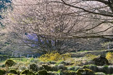 悠久の刻 溶岩でも噴き出したのか丸い石が散乱する山中にミツマタの黄色い花、樹齢1000年とも言われる樽井の大櫻があり、何も足さない、引かない世界が自然のまま生きています。