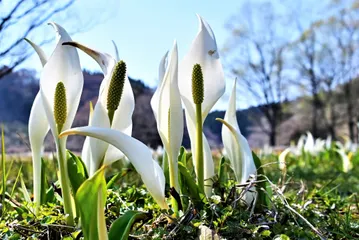 ミズバショウ 「水芭蕉」ですが、水のないところに咲いています。
