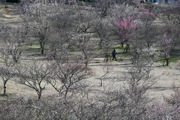私は梅花の香りを求めて訪問したのですが、花は盛りを過ぎてました。そんななか、ゆったりと犬を散歩させている人の姿が目に止まりました。