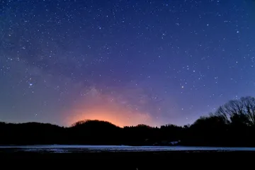 営みの光 18mmf/F2.8D 絞り開放 露光30秒 ISO2000 (撮影:2026年2月)スキー場が始業しました。直接光を避ける為に里山の陰に移動しました。天の川はスキー場のナトリウム灯?のオレンジ色の光にまみれています。星座は、中央上部にへびつかい座とへび座、昇ったばかりのわし座、たて座、いて座、さそ