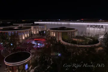 夜の大阪万博、ドイツ館 白く大きな四角形のKOREA館をバックに、地味に主張する円形建築見ていて何となくワクワクするパヴィリオン