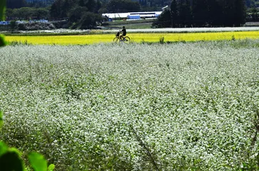 そば咲く家路 蕎麦咲く間道、少年が帰って行きます。山形にて