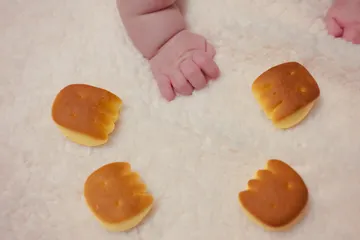 パンと同じ大きさ、可愛らしいお手てですね~。我が家の孫娘は、今月で7か月です。先月は、半年誕生日のお祝いをしていたみたいです。ジジババも見るだけで幸せです。これからの成長が日々楽しみですね。^^