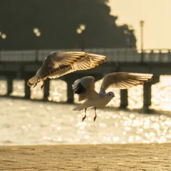 夕暮れ時 蒲郡竹島に繋がる棧橋と海面の煌めきを背景にこちらに飛んできたユリカモメ…パンを探しに来たのかな… #冬色チャレンジ