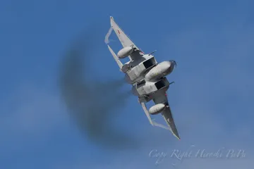 新田原から飛んできた梅組イーグルの機動飛行主翼のヴェイパーと尾翼が繋がってループウイング?のようになったイーグル!加えて排気煙が自分の影のようになって一体化してる最高のショットが撮れた!