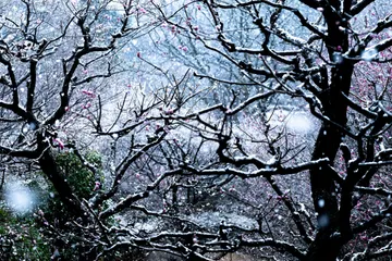 冷たい縁取り 2本の梅の木が雪で冷たく縁取られていて、互いに無関係な距離感にありながらも一緒に寒さが明けるのを待っているように見えました。