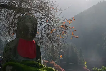 落葉が進んだ桜の木の下にたたずむお地蔵さまにも朝霧が掛かり、いい秋の風情ですね。