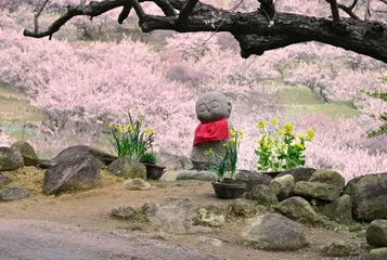 地蔵 梅林に小さなお地蔵様がありますが、梅の花をバックに嬉しそうですね。