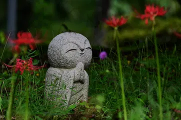 お彼岸の小地蔵さん 彼岸花咲く路傍の小地蔵さんは何を祈るのでしょう、頭上にはトンボが。