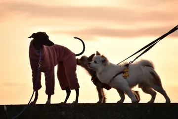 アニキ、かっこええ 夕暮れ時の堤防の上。犬ならではのワン シーン