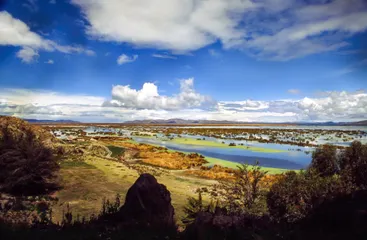 ↑:チチカカ湖全景。ペルーとボリビアの国境上にある「琵琶湖の12倍」もある広大な淡水湖で、標高は約3800m。富士山より高い場所にある湖。葦(アシ)を刈っている場面和船の「ろ(櫓)」のようなもので器用?にボートを操っていた少年。結構速い!。後ろに見えるのは葦藁でできた浮島。1996年に旅行で訪れたペ