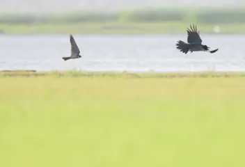 NEW 水辺の攻防 チゴハヤブサがカラスを追っていました。