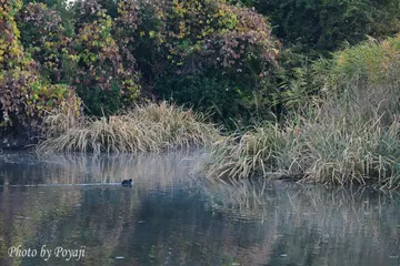 NEW 【秋色チャレンジ】あさもや 早起きして、秋色を探しに行きました。これまで秋に行ったことがなかったためか、肝心の赤や黄色に色付いた樹々を見つけることは出来ませんでした。でも、水辺の叢にはわずかですが薄い霜が降りていて、水面にはうっすらとモヤが浮いていました。そんな水面をすうっ~と泳いでゆく水鳥がなんか絵になるように思われ撮ってみ