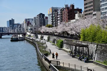 2026年4月3日、晴天、 浅草 隅田公園や船着き場はお花見客であふれていましたが、川沿いの散歩道は意外と空いていて、素敵なカップルのお花見姿を橋の上からパシャリ。