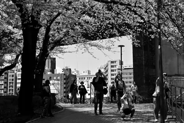 2026,4,3 晴天、お花見をしていた人たちが、一本のソメイヨシノ満開の所に来たら、一斉に上を向き、立ったり、しゃがんだり、色々なカメラで色々な姿で撮影していました。