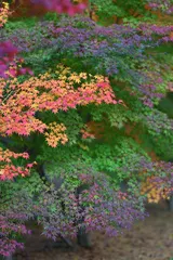 紅葉を撮影していると色とりどりの葉がファインダーに飛び込んできます。紅、燕脂、赤、橙、黄、緑、黄緑、紫、赤身を帯びた黄、エトセトラ。クレヨンで描こうとしたら、100色のクレヨンでも表現できそうもないなぁ。
