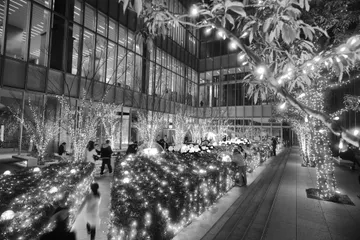 ブラックミスト効果 光と影:ハルカス300で夜景を撮った後、16階庭園のイルミネーションが印象的だったので撮った写真です。撮影時にブラックミストフィルターを使いましたが、白黒にリメイクすることでより効果的にイルミネーションが灯る様子が表現できたのではと思います。カメラ:Nikon ZRレンズ:Tamron