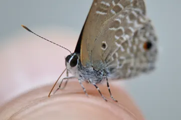 可愛いクマソ 過去作です。ベトナムで撮影したクロマダラソテツシジミと言います。名前が長いのでよく「クマソ」と呼ばれています。ソテツの葉を食草にしています。この個体は、私の手にとまり汗を吸っています。こんな停まり方もあるのですよ。^^手にとまっていた時にカメラにセットしていたレンズで撮りましたが、うまくピントが合っ