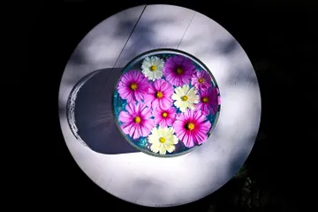 コスモス鉢 「コスモス鉢」 水に浮かんだコスモスが入った水鉢それが丸い台に置いてあった。 影とコントラストが面白く、真上から撮影してみた。 奈良県奈良市 般若寺にて