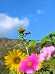 近くの畑に向日葵と秋桜。最近は、寒さに耐性のある品種が各地で植えられているようです。ひまわりとコスモスを同時に楽しめることが増えてきているので、撮影も楽しめます。