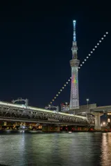 灯籠とスカイツリー 8/15 行われた灯籠流しです。この橋は、ふれあい橋と名付けられているのですが、スカイツリーとの写真で定番となっています。