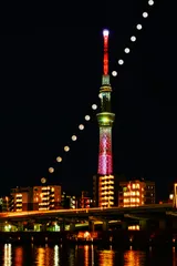 8/15 行われた灯籠流しです。この橋は、ふれあい橋と名付けられているのですが、スカイツリーとの写真で定番となっています。