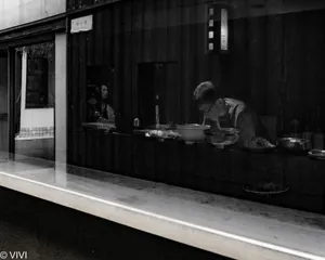 店主 今夜の開店に向けて店主がモクモクと準備をされています。硝子越しに撮影しました。