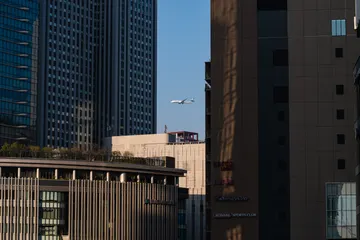ビルの間を抜ける翼 伊丹空港に着陸態勢のANAのボーイング787です。ルクア1100に当たる光が良かったです。