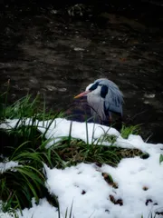 冬色チャレンジ(修行?) 寒風、積雪、凍てつく川の三重苦の鷺一匹。修行僧の様。